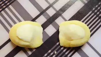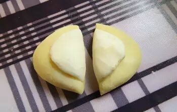 轻轻的用手心将其按紧,并将多余的白色面皮,包于黄色面团下