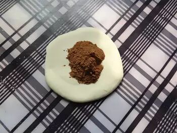 13.然后用咖啡色的面团 擀一个0.2厘米厚的面片儿