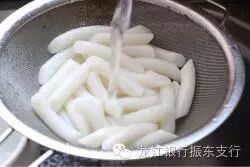 2.用冷水冲洗年糕后沥水备用。