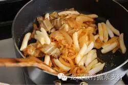 6.加入辣白菜炒出香味。