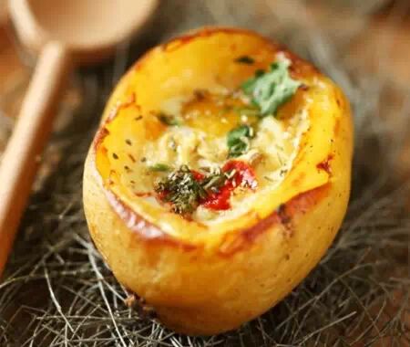 3)用刀削去一块土豆皮,用小勺挖一个洞