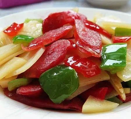 12)最后加入正好的腊肠,翻炒均匀即可出锅。