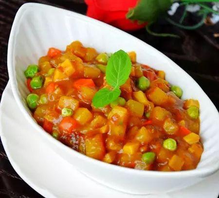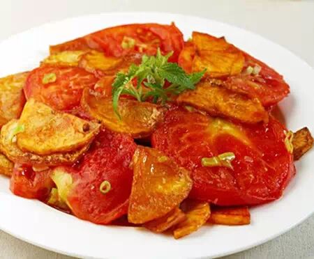 西红柿400g、土豆300g、油适量、盐适量、绵白糖、适量白醋、少许鸡精、1/8勺牛至叶1/4勺、大葱10g