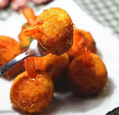 12)然后裹上面包糠,再把虾尾插在上面13)入油锅炸到表面金黄取出