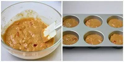 8、拌好的面糊倒入麦芬模具中,7分满(我的模具口径较大,我只倒了1/2左右)