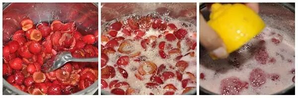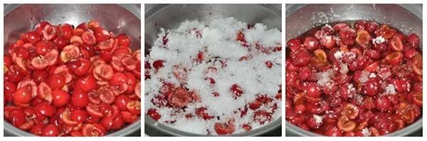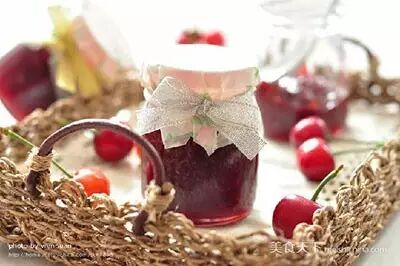 装果酱的瓶子事先要用开水烫一下后控干水分。熬煮果酱不必到汤汁全部收干,樱桃中析出的果胶会使果酱冷藏后变的浓稠。