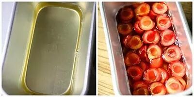 8、将樱桃整齐的排列进去,放冰箱冷却凝固。
