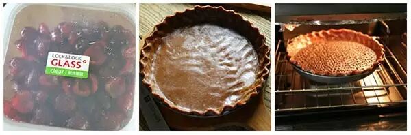 低筋面粉(派皮材料)120克、黄油60克、细砂糖30克、可可粉30克、蛋液30克、黄油(巧克力馅材料)20g、牛奶50g、淡奶油100g、黑巧克力50g、蛋液20g、盐一小撮、新鲜樱桃(樱桃馅儿)300g、细砂糖20克、柠檬汁10ml、朗姆酒10ml、玉米淀粉适量