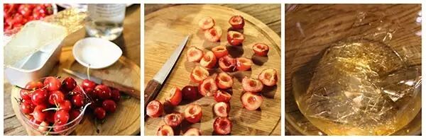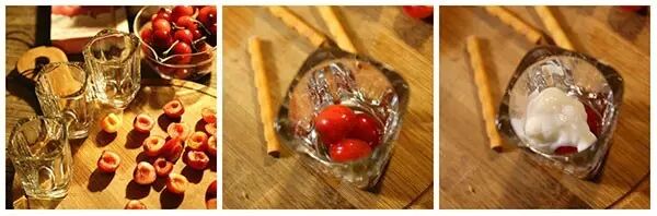 2、樱桃切开,去柄去核。一口杯底垫入几个半颗的樱桃。