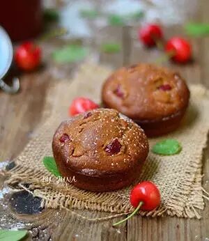 低粉100g、红糖60g、牛奶80g、鸡蛋20g、新鲜樱桃80g、玉米油30ml、泡打粉5ml、盐1.25ml