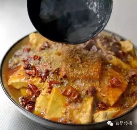 把煮好的豆腐放在炒好的炒好的配菜上,然后加汤和辣椒面、胡椒面,再撒上干辣椒和花椒;最后一步是泼上热油,就可以开吃了。