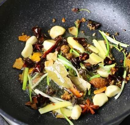 1.锅烧热,爆香葱姜蒜,干辣椒,八角,桂皮,香叶,草果。