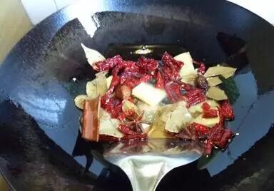 2.接着下干辣椒、花椒、桂皮、香叶、八角、白芷、豆蔻、丁香、陈皮、草果、小茴香、甘草煸炒出香味;