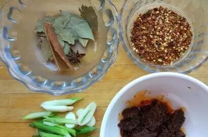 4.热锅热油,爆香八角、桂皮、香叶、花椒、辣椒碎、葱、蒜。
