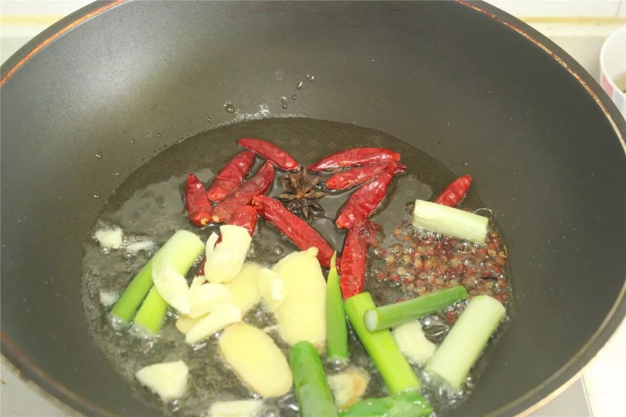2、【开炒】锅里放稍微多一点的油,烧到五成热的时候放葱、姜、蒜,花椒、八角、干辣椒炒出香味。