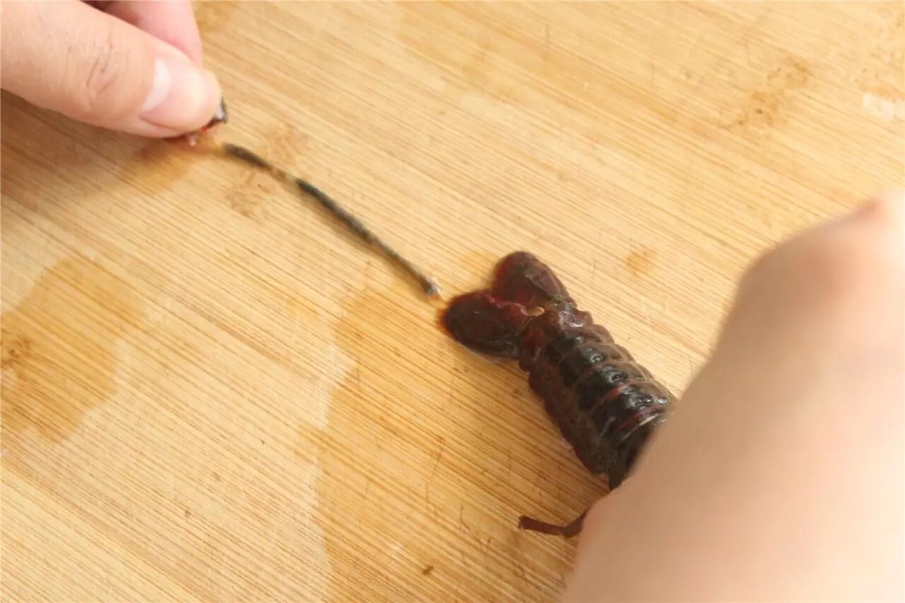 然后把小龙虾放到案板上,找到尾巴中间的那一片,左扭扭右扭扭然后轻轻抽出来,虾肠就出来了。ok!处理完毕!一个个虽然有点麻烦,但是最后真的会值回票价!