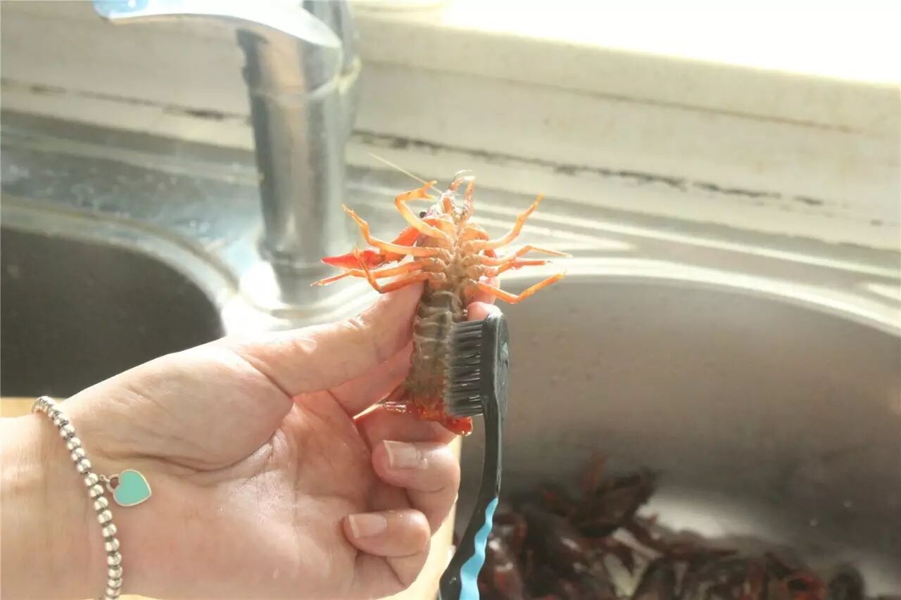 1、【清理龙虾】很多人都不知道怎么清洗龙虾,那么现在由女汉子博主来给大家讲解一下。直接拿住龙虾头部的两边,这样它怎样张牙舞爪都无济于事了!然后拿一个刷子从肚子刷起,全身刷一遍,黑色的部分使劲刷,只要不是壳子上面的黑,就都能刷掉。