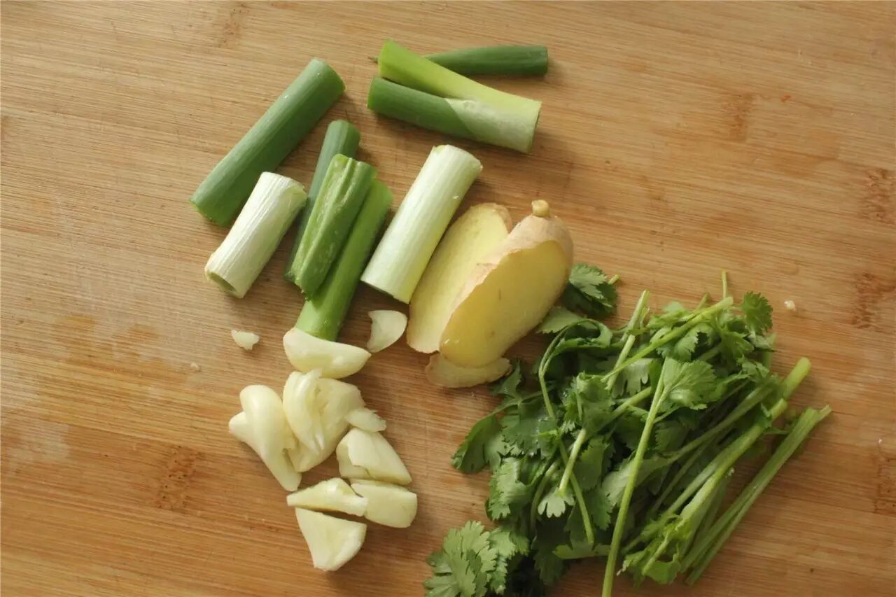 【准备工作】葱姜蒜切切好备用。香菜切段备用。