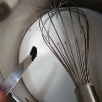 2.加入淡奶油,用刀剖开香草豆荚,刮出香草籽,连同外皮一起加入鲜奶中。