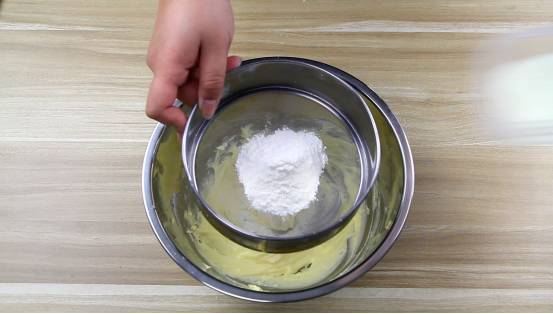 最后筛入100g低筋面粉和25g高筋面粉,用刮刀把它们融合在一起,