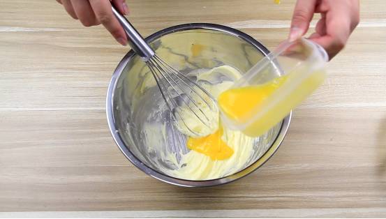 用打蛋器打出纹路后,放入柠檬汁继续搅打,打至小弯钩状,