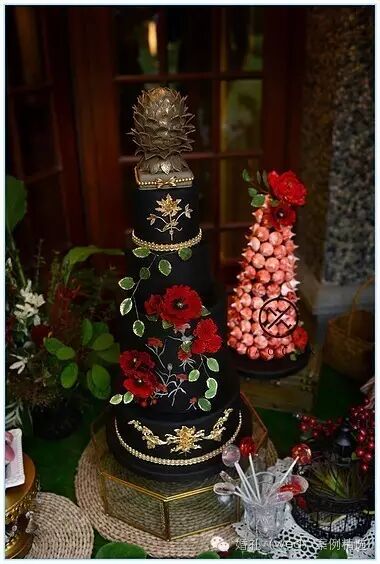 一场在5月的婚礼,红黑金的DG风格,正逢母亲节,新人也希望用这个场合来感谢父母,所以在主蛋糕上手绘了一些康乃馨的花朵