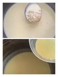 2. 加入吉利丁片,拌匀。待淡奶油冷却后,加入柠檬汁,搅匀