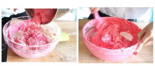 4 把剩下全部蛋清放进去,这时候注意要轻轻地从下往上搅拌。