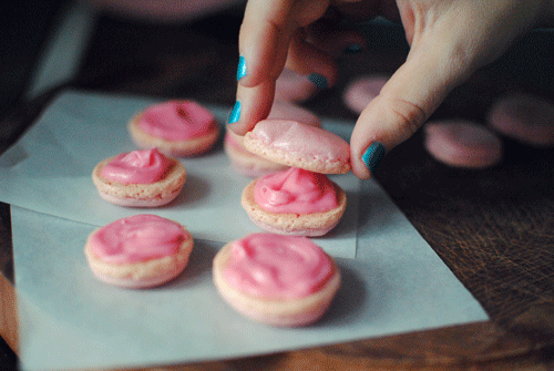 8 最后把冰淇淋放在马卡龙饼干上,再用另一个饼干盖住就可以拉!