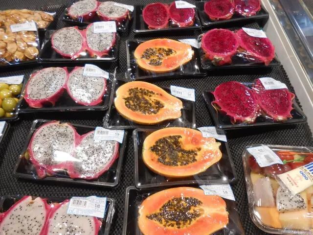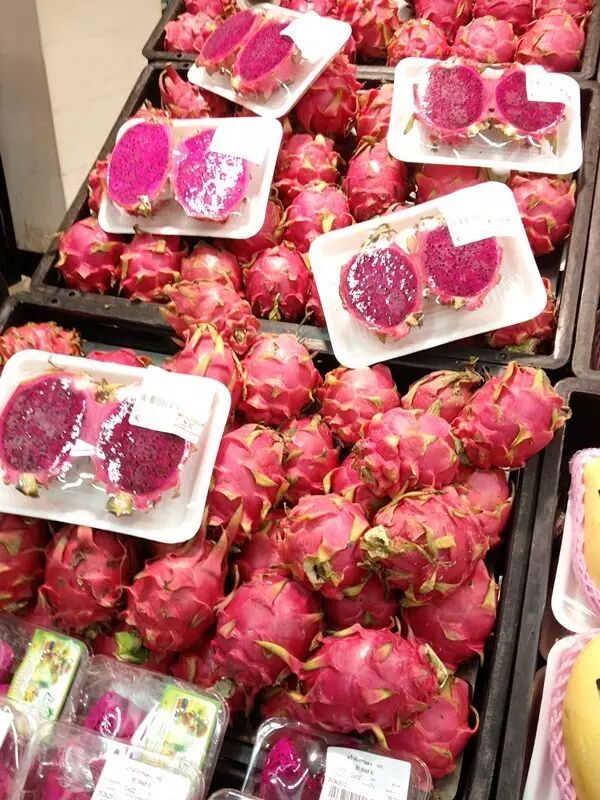 第二天,记者来到某大型超市,在火龙果区摆放着切开的和完整的两种。一位工作人员正在给一位销售人员“授课”,他手里拿着一个表皮发黄的火龙果说,“这种发黄的一看就老了,消费者不会买这种,但把它切开把果肉露出来,再用保鲜膜包上卖,也不直接说是特价,反倒卖得好。”