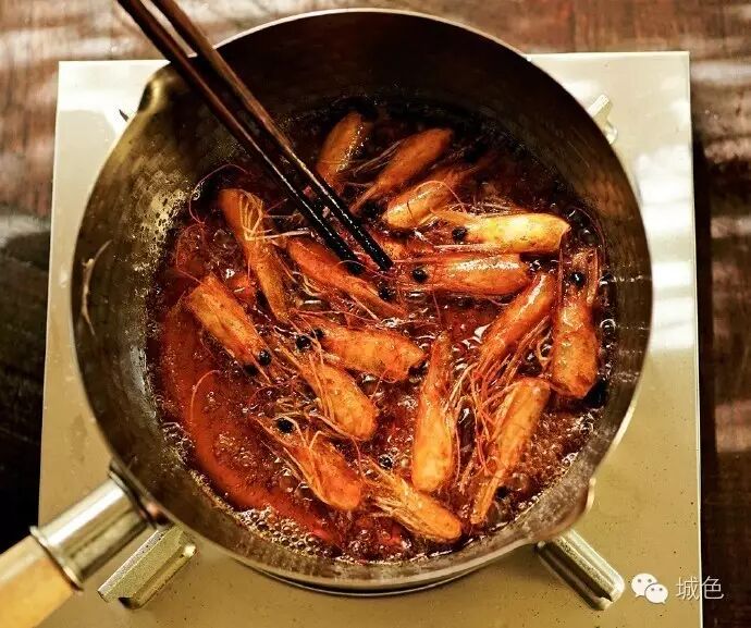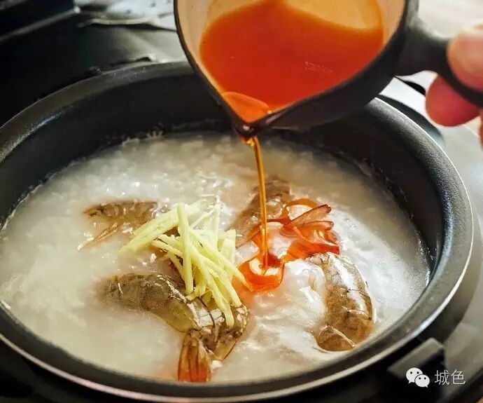 4、粥煮好放姜丝和腌好的虾,两大勺虾油,适量盐和胡椒粉,拌匀后煮至虾熟即可。
