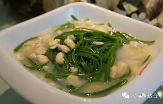 制作方法:锅内盛高汤放入老豆米煮烂,加洱海海菜调味煮沸,淋明油即可。
