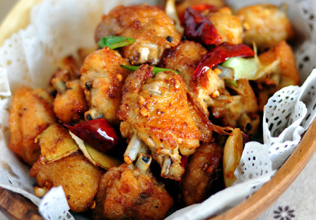 9、继续加热油至8、9成热时,再次下入鸡翅,迅速翻炸20到30秒钟,至鸡翅表面酥脆