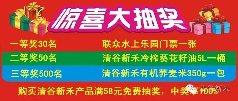 A:只要您购买清谷新禾产品满58元,您可以凭刚刚超市的购物小票到刚刚总店、批发城店、铁南店、草根店、麦苗店、绿岛店、新都汇店、三中店、心田店、青春豆店、秦风店、平安兔儿岭店、沈铁兔儿岭店指定的抽奖区参与抽奖
