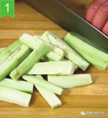 1 茄子洗净去皮,切成5厘米长、1厘米宽的条。