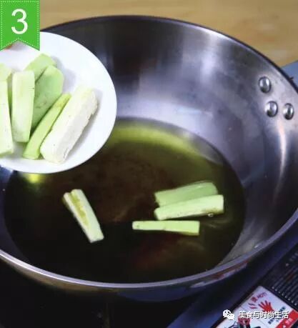 3 坐锅点火,倒入色拉油烧至六成热,投入茄条炸至呈金黄色,倒出沥干油分。
