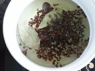 4、小锅里放入大量植物油,冷油放入15克花椒15克藤椒和大料,香叶、桂皮、丁香、草果,小火爆5分钟左右。