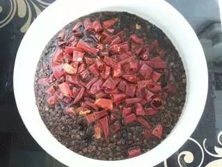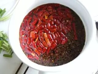 5、关火后倒入30克的干辣椒。让油的余温来烹出干辣椒的香味和辣味即可。然后将油锅里的香料全部捞出来扔掉。只留油备用。
