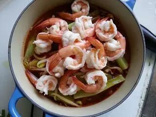 11、将炒好的豆芽和莴笋连同汤一起倒入大盆里,然后在铺上煮好的虾。