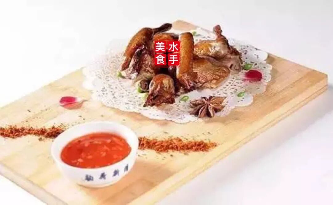 3、上菜时,把晾干的乳鸽放入五成热的油锅里,炸至表皮金黄酥脆,捞出斩块装盘,随配五香盐和泰式甜辣酱碟上桌蘸食。