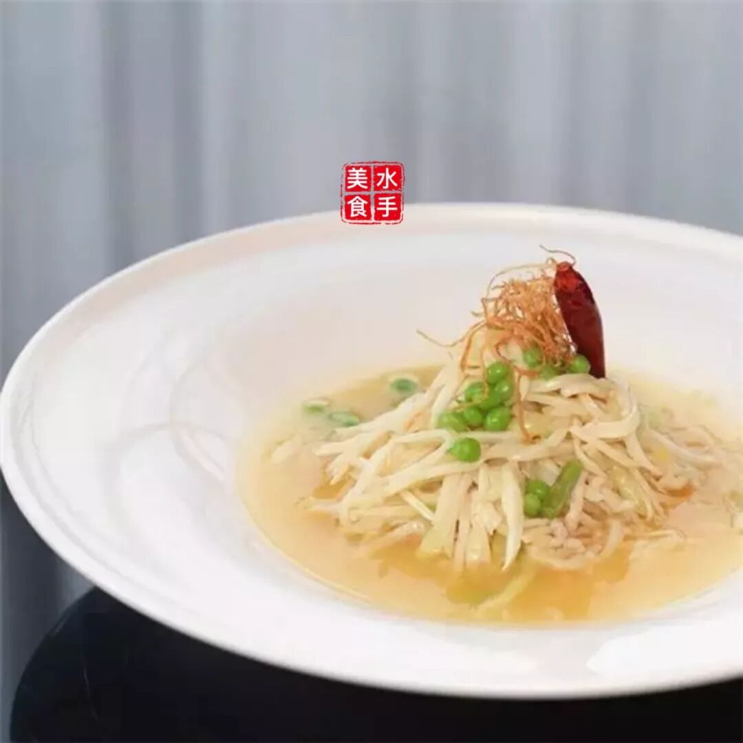 4.取一个锅子倒入油,油温在80℃左右时放入腌制好的鸡丝拉油,捞起后再放入筊白笋丝、广东丝瓜,下锅5秒捞起备用;将锅子多余的油倒掉,放入爆香炒料(去皮嫩姜、小葱、蒜茸)炒香后,接着把过油的所有食材放入锅里大火快炒调味(盐、鸡粉、糖、蚝油)之后装盘。