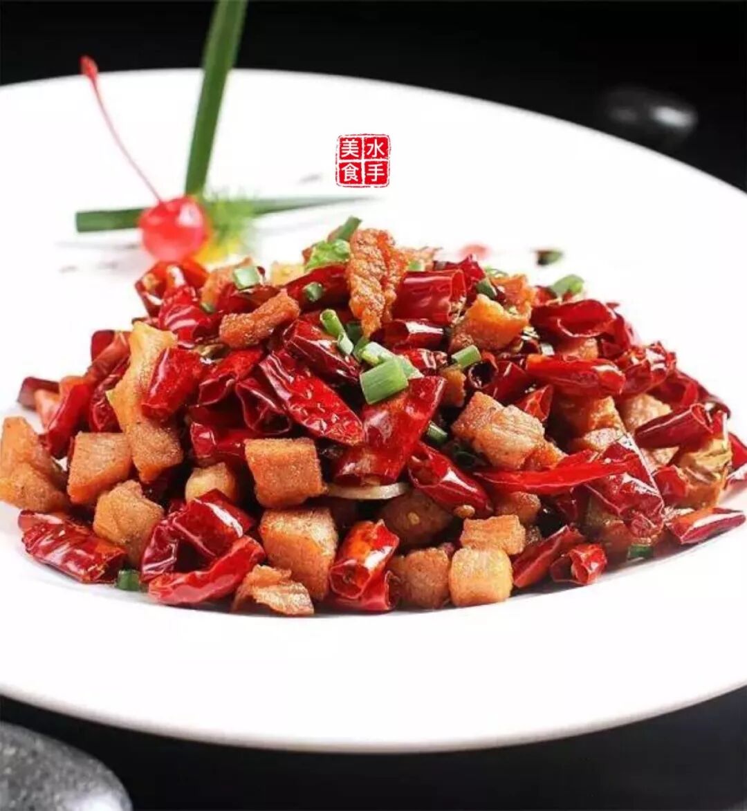 猪颈肉200克、干辣椒节100克、花椒、姜片、蒜片各10克