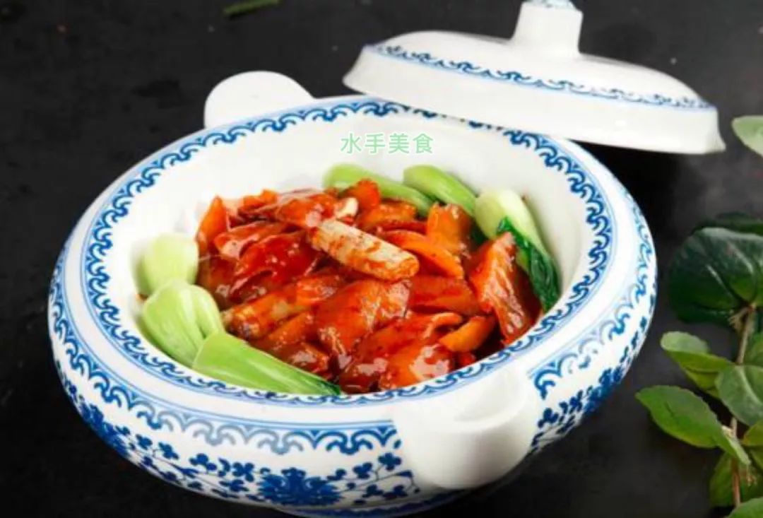 5、炒锅内放入30克葱油,倒入50克五花肉片、50克小香葱炒香,烹入6克花雕酒、150克水、15克蚝油、8克白糖、10克鸡粉,放入煨好的猪婆参、炸好的京葱段、8克老抽,烧制3分钟,勾芡淋入葱油即可。