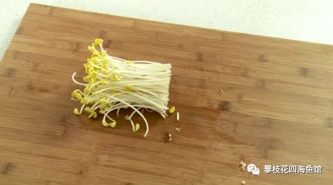 锅入油,倒入黄豆芽,炒软,放少许盐,炒熟,盛入碗中垫底。