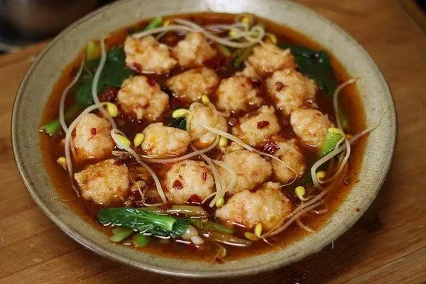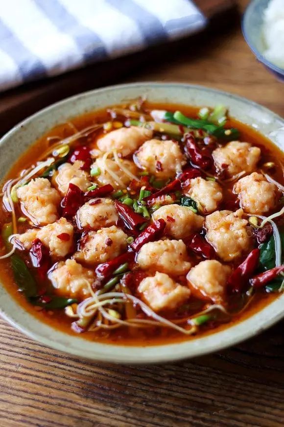 15.虾滑上放入干辣椒、葱绿,泼上热油,听见“呲呲”的声音,闻到香味就好了。