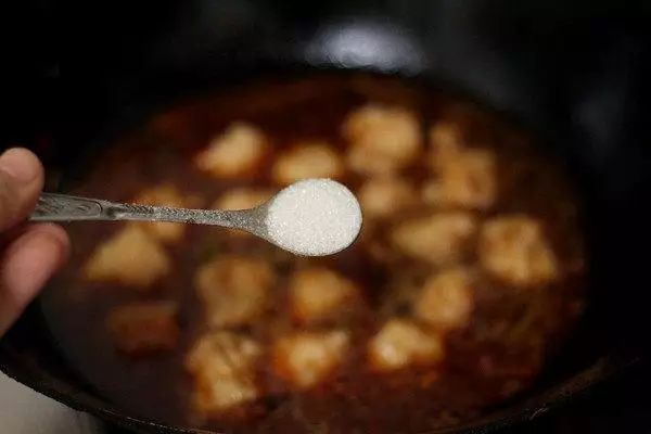 9.所有虾滑滑入锅中,大火烧开。放入白糖、生抽、盐调味。