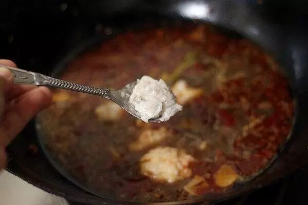 8.用勺子挖一勺虾滑泥,放入烧开的汤中,待虾滑稍微定型,搅动一下,再放下一个。