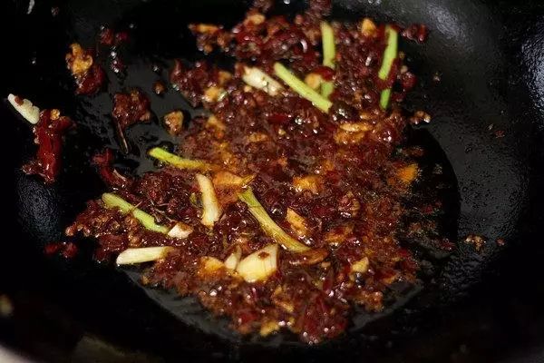 7.再放入豆瓣翻炒,炒出红油。倒入适量的开水烧开。