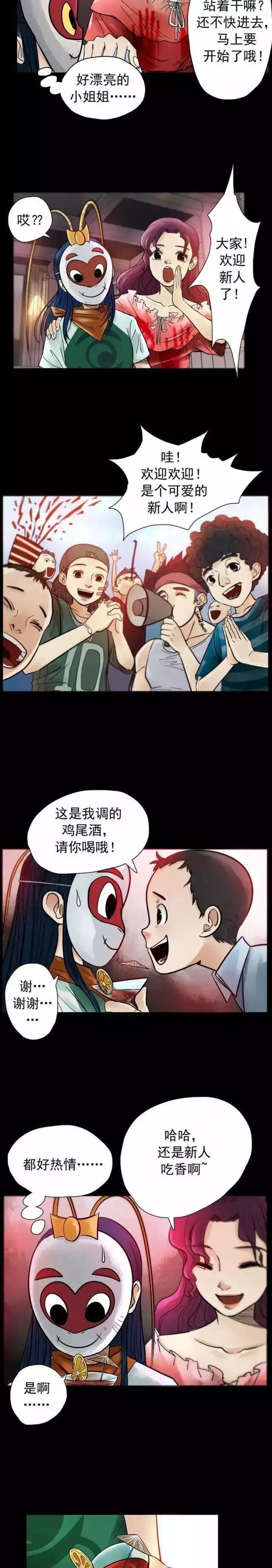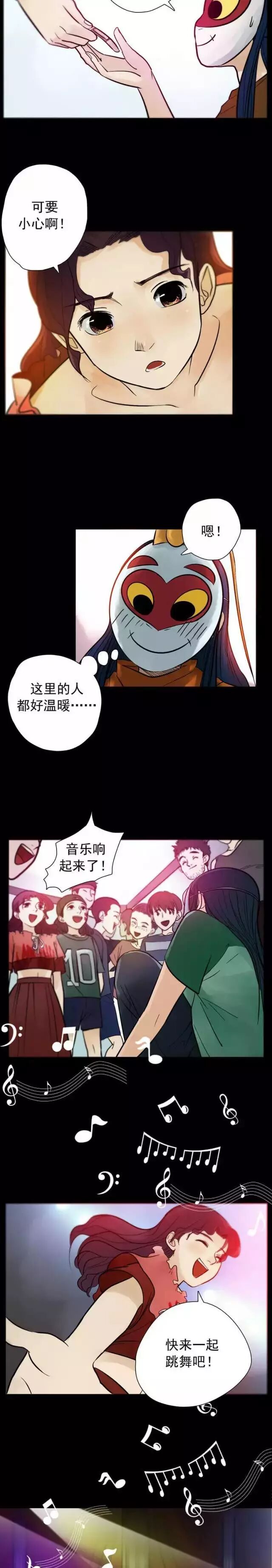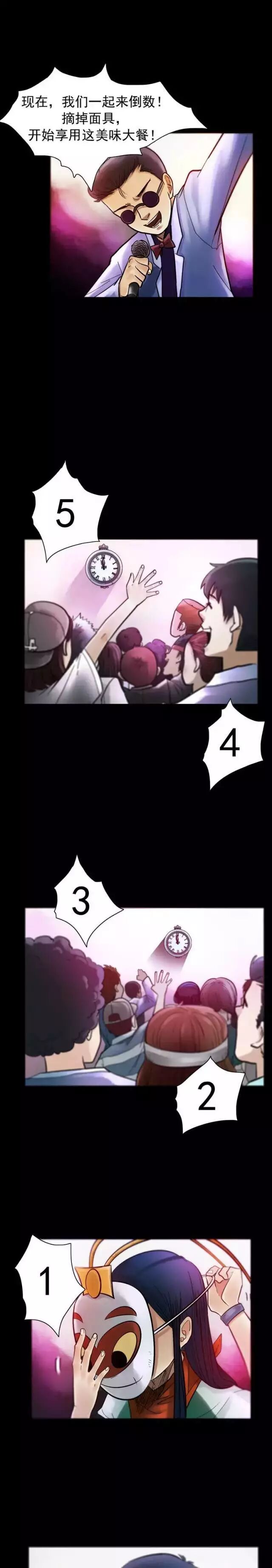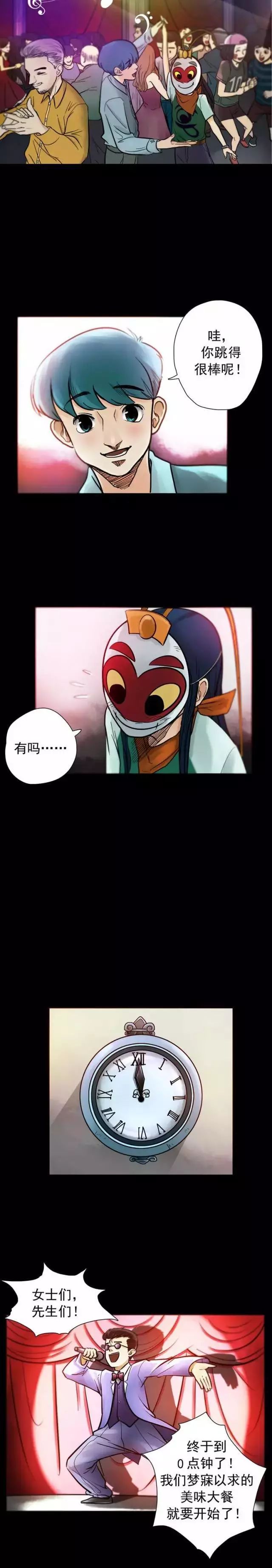 其实这个化妆舞会现场热舞的人,都是穿着人皮囊的鬼怪们(化的是人皮妆),他传单上说的所谓的免费终极美食,就是贪便宜、想来免费吃美食的女主角自己(对怪物们而言是美食)。怪物们看到女主角不小心划伤了脚那么体贴,只是不想晚餐被弄脏了而已。所以说,天上不会掉馅饼,千万别随便贪便宜,不然,小心把自己都栽进去。