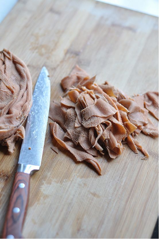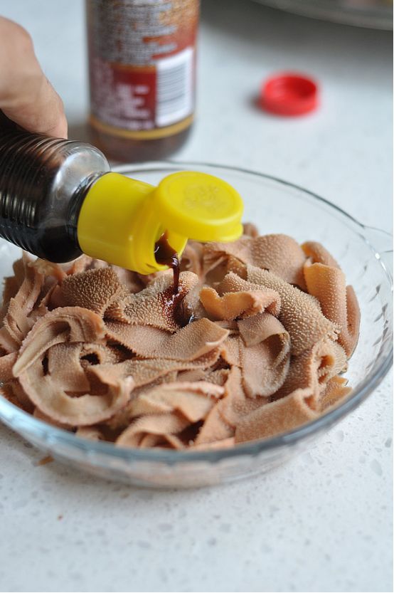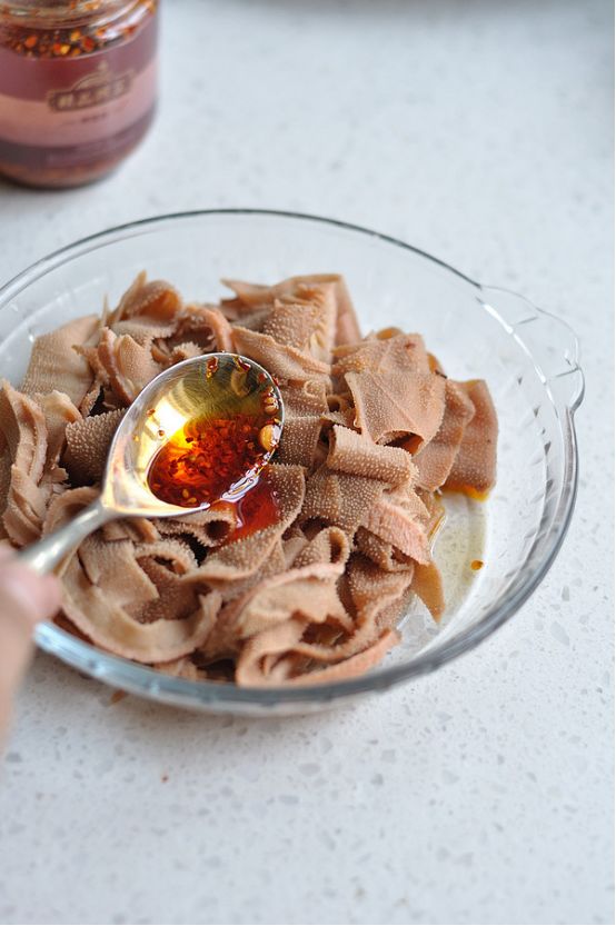 5.把焯过水的牛百叶捞出控净水分,调入1汤匙凉拌酱油。